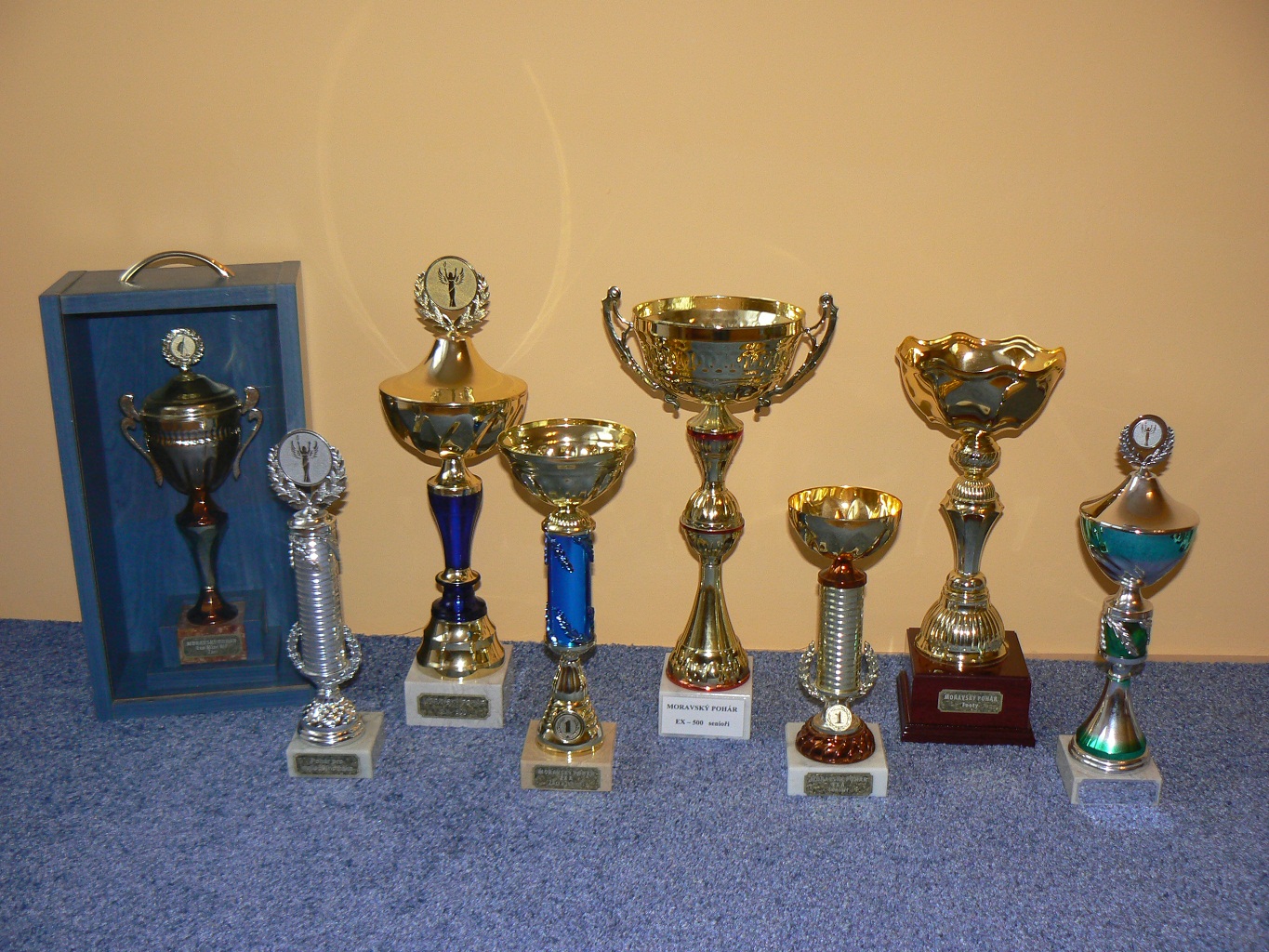 Poháry zleva: Eco Mini Standard žáci, Eco Mini Expert žáci, EX-500 žáci, EX-A žáci, EX-500 senioři, EX-A senioři, Footy, F4A žáci